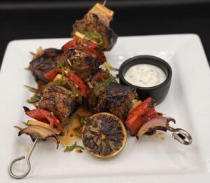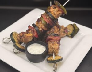 ⚡ High protein, low-carb, and light on fat…lean and nutrient-dense meal!⚡ Servings: 4 (2 skewers each) Calories: 235 per 2 skewers (recipe-calculated ~253 with sauce) Protein: ~28 g Carbohydrates: ~13 Fat: ~9 g Cook Time: 55 minutes Ingredients For