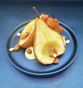 Baked Pears with Vanilla & Almonds Servings: 1 eaCook Time: 30 minutes Ingredients Ingredient Quantity Notes Pear, halved and cored 1 each Ripe but firm Vanilla extract ½ tsp Cinnamon ½ tsp Ground Honey, local 1 tsp